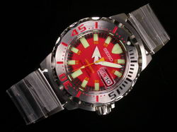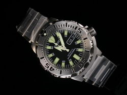 Here's a brand you don't hear about too often - manufactured mainly for the SE Asian market and mainly available in Thailand, Burma and China, OP (Olym Pianus) are known chiefly for their Rolex style designs. This one is no exception but is equipped with good sized tubes and no premium for blue tubes at 3, 6, 9 and 12! The case finish on this is superb at this price point and is, dare I say it not far off that of the watch on which it is based. Bezel action is tight and precise with no slop. Superb value for money. Note that this isn't a dive watch per se, but styled as such.