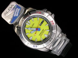 Case: Stainless steel; diam. 38mm across the bezel; thickness 11mm; brushed top with polished sides; unidirectional diver's bezel with 120 clicks; sapphire crystal with cyclops lens; screw down crown; lug width 20mm; water resist 30m. Left side of case engraved 'Olympia'.