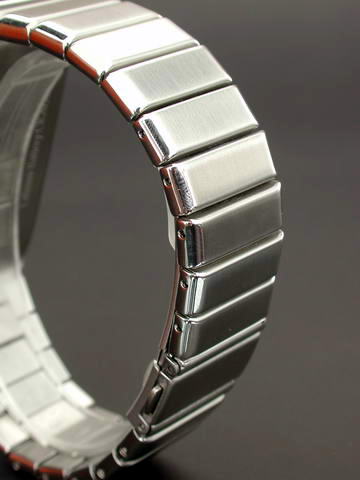 On first pressing the function button, the LEDs perform a little dance for 2 seconds and then the current time is displayed for 5 seconds. Reading the time is simply a case of reading the digits lit across the display - thus 1,2,4,1 would indicate 12.41 with the Martini glass lit if the watch has been set to 12 hour mode and it is 12.41pm, the day and date are just as easily read if one remembers the 'code' for the day with Sunday being 1; likewise the year is read in the same way as the time (2,0,0,4 being 2004). The good news in the case of the Star Performer is that is is actually possible to read the display even in bright daylight thought I suspect that this may be an evening out watch for many wearers. Setting the watch is via a recessed button also on the right hand side of the case. This is all fairly intuitive and is a case of entering the setup function from whichever mode you are in (e.g. to set the year, the watch must be displaying the year via the LEDs). Therefore one must be a little quick off the mark and ensure the setup button is pressed before the display extinguishes. One question is of course the old chestnut with anything LED - battery life. The Star Performer takes a lithium CR2032 which I am sure it needs given that for seven hours every day by default the display is entertaining the wearer. No battery life estimations are given in the instructions but changing the battery should be a snip and Lithium cells are not expensive these days. With regard to accuracy then this is a quartz watch and whilst I haven't tested accuracy I would safely assume that it will be far more accurate than the majority of mechanicals and just as accurate as other quartz equipped watches such as Casio and so on. All good fun and certainly different. The little dances that the LEDs perform at various times are interesting to watch and I am sure would be a good talking point for those wearing the watch. I have to admit again that I find the whole thing fascinating in the least and this is a very novel way of telling the time. Case The case and bracelet combination of the Star Performer weigh in at a not inconsiderable 130 grams. The case itself has dimensions of 29mm width by 56mm length by 11mm depth. The lug width is an unusual 21mm. Tokyoflash state on their site that the case is all stainless steel; it is very well finished indeed and feels extremely solid. The brushing to the top is excellent, matching the bracelet very well and the polish to the remainder is also of a very high standard. Basic water resistance means that the watch is designed to withstand accidental splashing only - thus it would be inadvisable to wear it even whilst showering I would say. However, this watch will more than likely be an occasional wearer for many purchasers who would no doubt have something more sporty for diving into swimming pools and so on. The crystal is a curved mineral with the underside treated as mentioned previously. The silvered icons and digits are a very clever design feature in my opinion and give the watch some character when they reflect the ambient light; preferable to a large expanse of black glass which would otherwise be the case. Of course, as befits this concept, the digits are of the 'computer' or 'digital' type font which works well - I don't think anything else would suit. The case back is brushed stainless steel with 'Pimp' in large letters and 'Water Resistant', 'Stainless Steel Back', 'Lithium Battery CR2032'. As one might expect, the back is of the snap on type which should aid quick battery replacement and one corner has a raised tab under which a small knife should fit quite easily.
