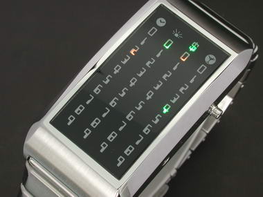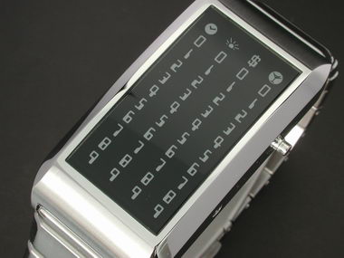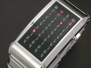 I am a little uncertain where the inspiration for the latter function came from but there you have it. The image above gives an idea of what the display looks like when the watch performs its dance. There is a main function selection button on the right hand side of the case. The first press and the watch displays the time in either 12 or 24 hour format (depending on how one has set the watch) using all four columns; the second press of the button (whilst the time is displayed) and the watch displays the day and date using the first, third and fourth columns; the third press of the button and the year is displayed using all columns: